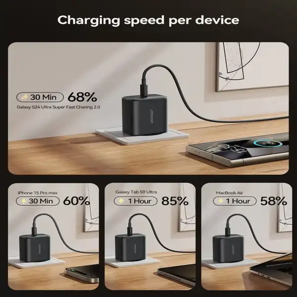 - توان 45 وات واقعی مناسب برای گوشیهای پرچمدار و لپتاپهای سبک مانند MacBook Air