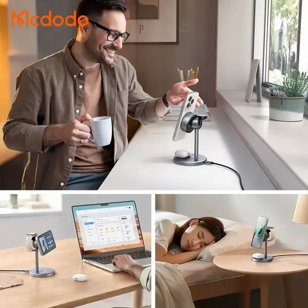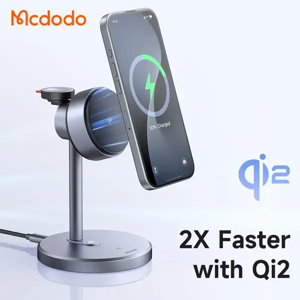 استند شارژر وایرلس مک دودو مدل CH-2462 یک پایه شارژ چندمنظوره با طراحی مدرن و توان ۲۲.۵ وات است که امکان شارژ همزمان گوشی، ایرپاد و اپلواچ را فراهم میکند. این محصول با فناوری Qi2، اتصال مغناطیسی دقیق و ساختار ایمن، گزینهای مناسب برای کاربران اپل و دستگاههای سازگار با شارژ بیسیم است. طراحی رومیزی و ظاهر مینیمال آن، استفاده در خانه، محل کار یا کنار تخت را بسیار راحت و جذاب میسازد.