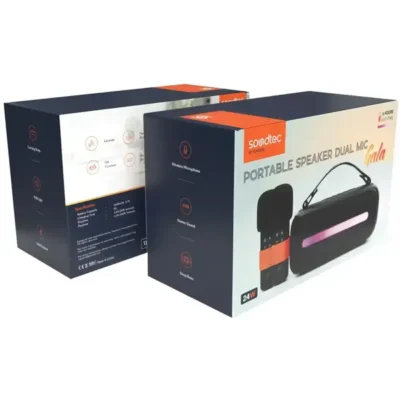 Porodo Gala Soundtec 14W با طراحی قابل حمل و دسته نگهدارنده عرضه شده است. این مدل با دو درایور 2.5 اینچی و توان RMS مجموع 12 وات (پیک 24 وات) صدایی شفاف و قدرتمند تولید میکند. باتری 3600mAh امکان پخش موسیقی تا 6.5 ساعت را فراهم میسازد. همچنین وجود