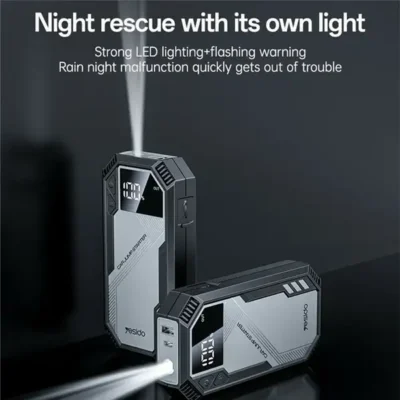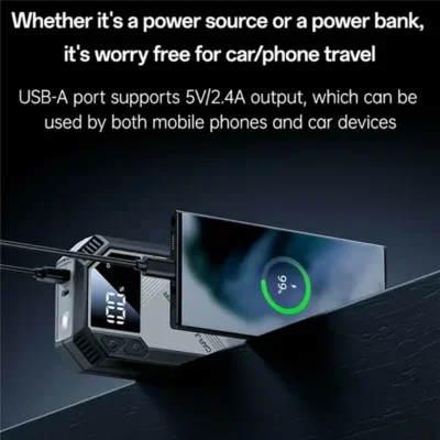 پاوربانک نیز قابل استفاده است و میتواند موبایل و گجتهای USB را شارژ کند. طراحی کوچک، وزن کم و ایمنی بالا، این مدل را به گزینهای ایدهآل برای خودرو، سفر و شرایط اضطراری تبدیل کرده.