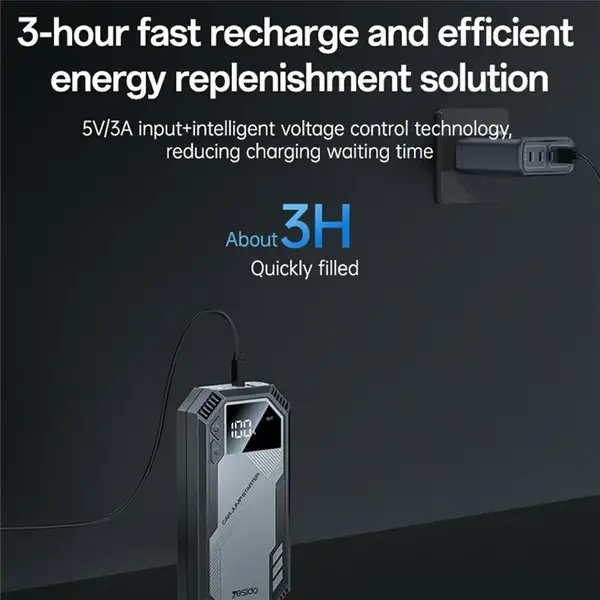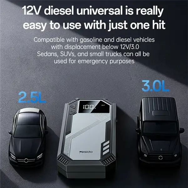 YESIDO VC11 یک جامپاستارتر جمعوجور، ایمن و کاربردی است که با ظرفیت 6000mAh، گیرههای هوشمند و سازگاری با خودروهای 3.0 لیتری، یک ابزار ضروری برای هر راننده محسوب میشود. این مدل علاوه بر روشن کردن خودرو، بهعنوان پاوربانک نیز کاربرد دارد و برای سفر و شرایط اضطراری انتخابی ایدهآل است.