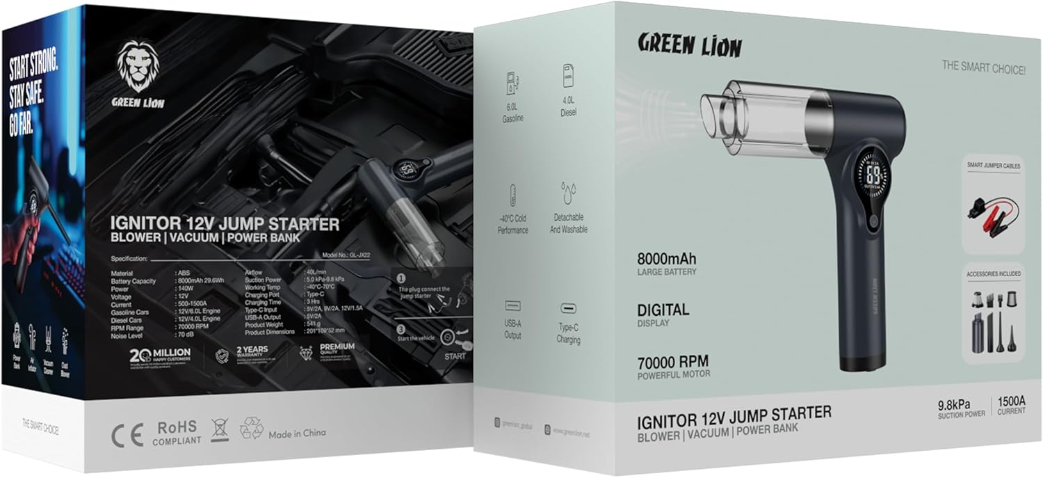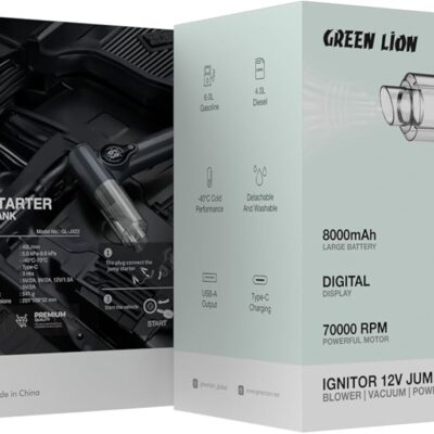 Green Lion Ignitor 12V Jump Starter, Blower, Vacuum, Power Bank با ترکیب چهار قابلیت مهم، یک انتخاب عالی برای رانندگان و علاقهمندان به سفر است. این محصول با کیفیت ساخت بالا، طراحی جمعوجور و امکانات کامل، تجربهای ایمن و کاربردی در خودرو و زندگی روزمره فراهم میکند.