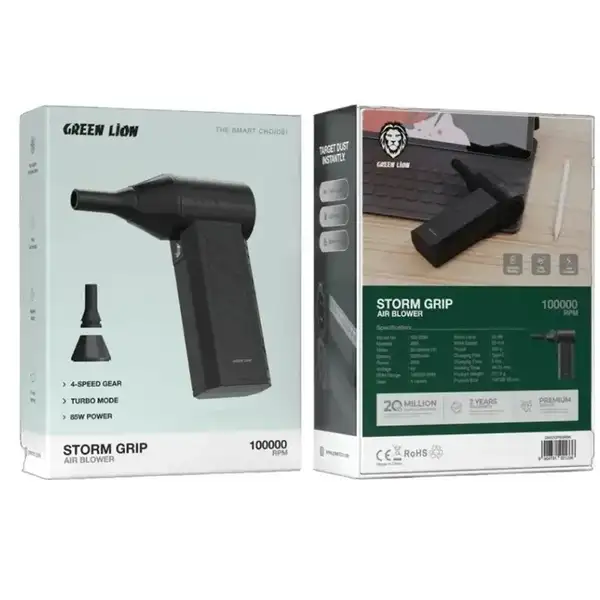 Green Lion Storm Grip Air Blower یک دمنده قدرتمند و قابل حمل است که برای پاکسازی گرد و غبار از تجهیزات الکترونیکی، لوازم خانگی و محیطهای کاری طراحی شده. این محصول با طراحی ارگونومیک دستهدار (Grip) و موتور پرقدرت، جریان هوای متمرکز و پایدار تولید میکند و جایگزینی مناسب برای اسپریهای هوای فشرده محسوب میشود.