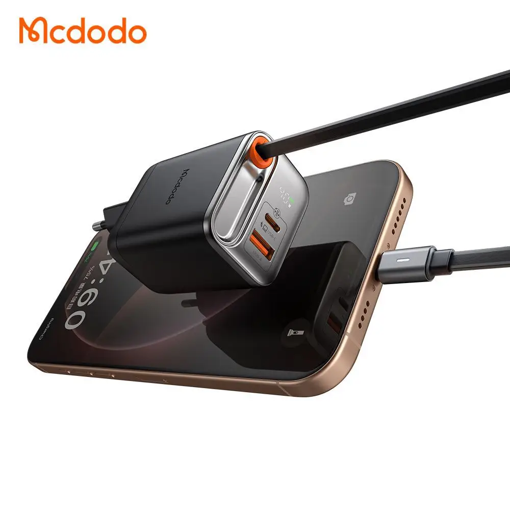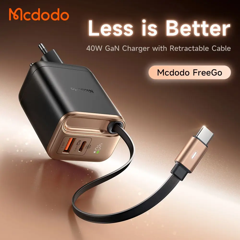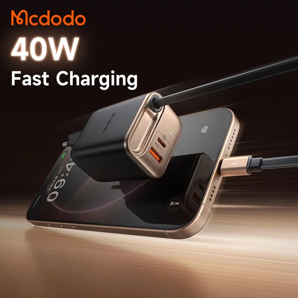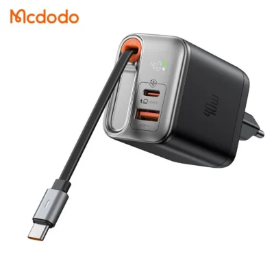 شارژر آداپتور دیواری 2 پورت 40 وات مک دودو مدل MCDODO CH-428 GaN با کابل داخلی جمعشونده Type‑C، طراحی هوشمند و فناوری پیشرفته، انتخابی عالی برای کسانی است که به دنبال یک شارژر