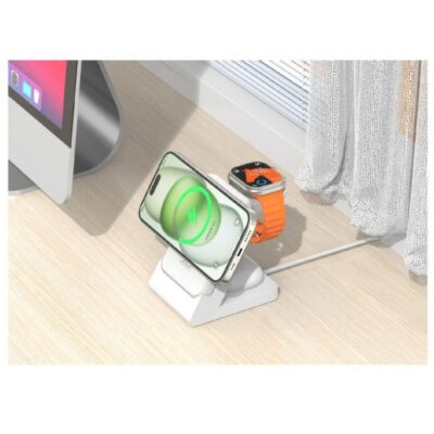 شارژر بیسیم رومیزی عمل میکند. این مدل با طراحی مدرن و جمعوجور، قابلیت شارژ همزمان چند دستگاه (گوشی هوشمند، ساعت هوشمند و هدفون بیسیم) را دارد و برای کاربرانی که به دنبال یک راهکار همهکاره هستند بسیار مناسب است.