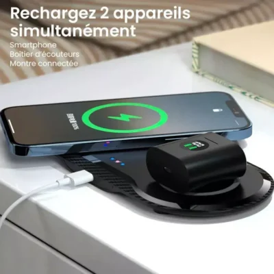 XO WX025 یک شارژر بیسیم دوگانه با توان کلی ۲۰ وات است که امکان شارژ همزمان دو دستگاه را فراهم میکند. این محصول با طراحی مدرن و استاندارد