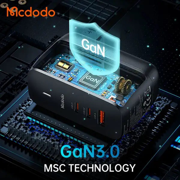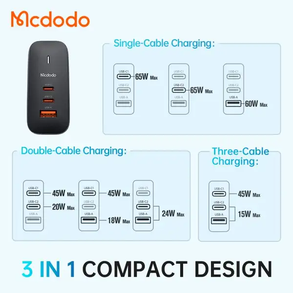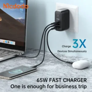 شارژر دیواری مک دودو مدل CH-844 با توان 65 وات، سه پورت خروجی، کابل تایپسی همراه و طراحی مقاوم، انتخابی عالی برای کسانی است که به دنبال یک شارژر قدرتمند، ایمن و قابل حمل برای شارژ سریع و همزمان چند دستگاه هستند.