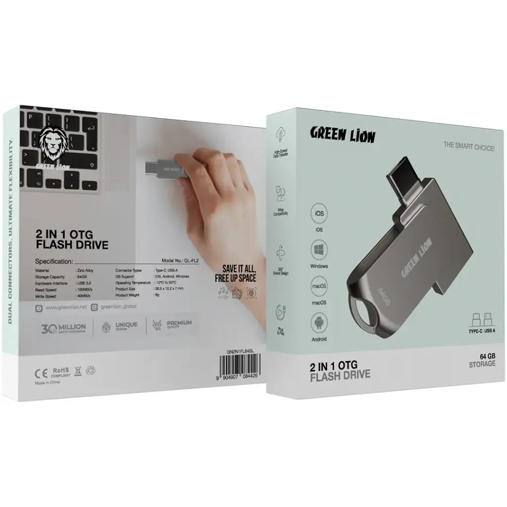 فلش مموری 256 گیگابایت گرین لاین مدل Green Lion 2 in 1 OTG USB‑C Flash Drive USB 3.0 GN2N1FL256SL