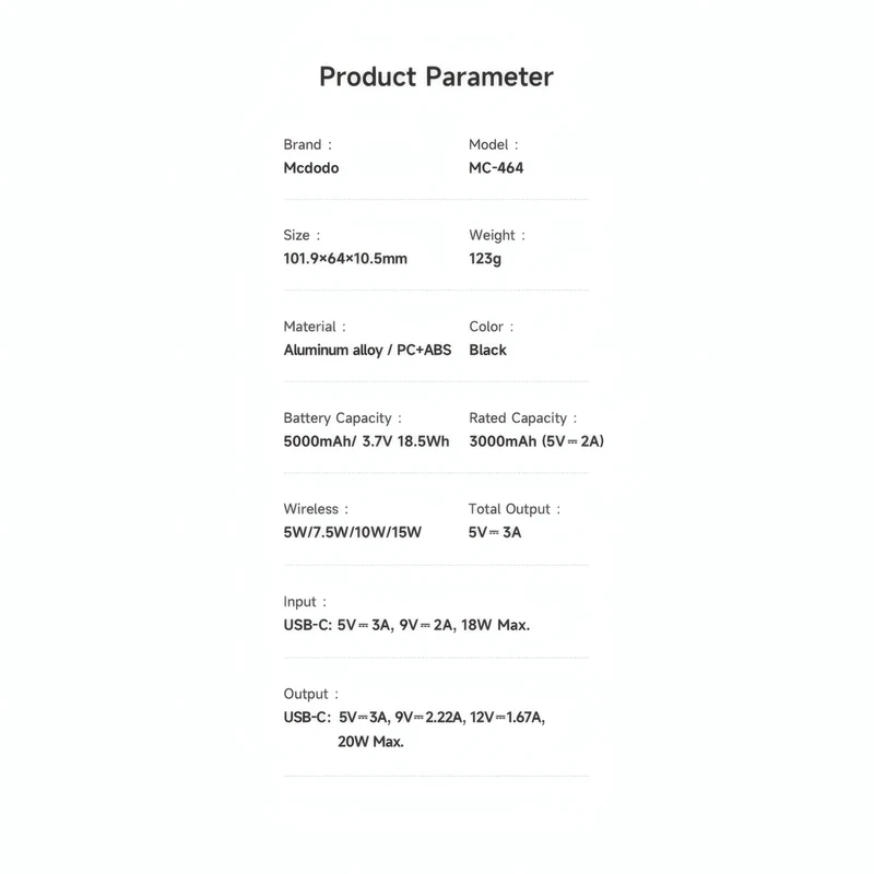 پاوربانک وایرلس مکدودو مدل MC-464 با ظرفیت ۵۰۰۰ میلیآمپر ساعت و توان ۲۰ وات