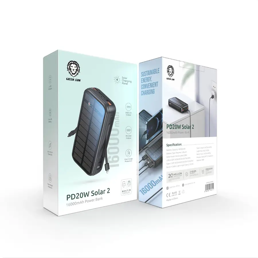 پاوربانک Green Lion Solar2 16000mAh با ظرفیت مناسب، پنل خورشیدی قدرتمند 20 وات، فناوری شارژ سریع و طراحی مقاوم، انتخابی عالی برای کسانی است که به دنبال یک پاوربانک