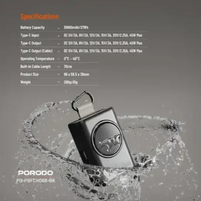 PORODO PB068 با ظرفیت مناسب، فناوری شارژ سریع PD، کابل داخلی و نمایشگر دیجیتال، یک انتخاب حرفهای برای شارژ سریع و ایمن دستگاههای دیجیتال است. این محصول با طراحی سبک، سیستم ایمنی داخلی و کیفیت ساخت بالا، همراهی مطمئن برای کاربران مدرن در خانه، محل کار و سفر محسوب میشود.