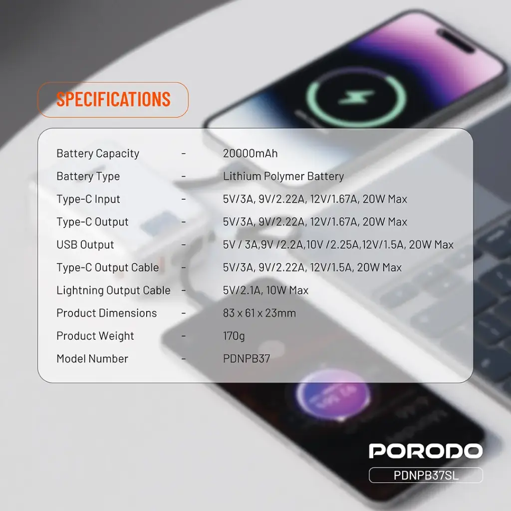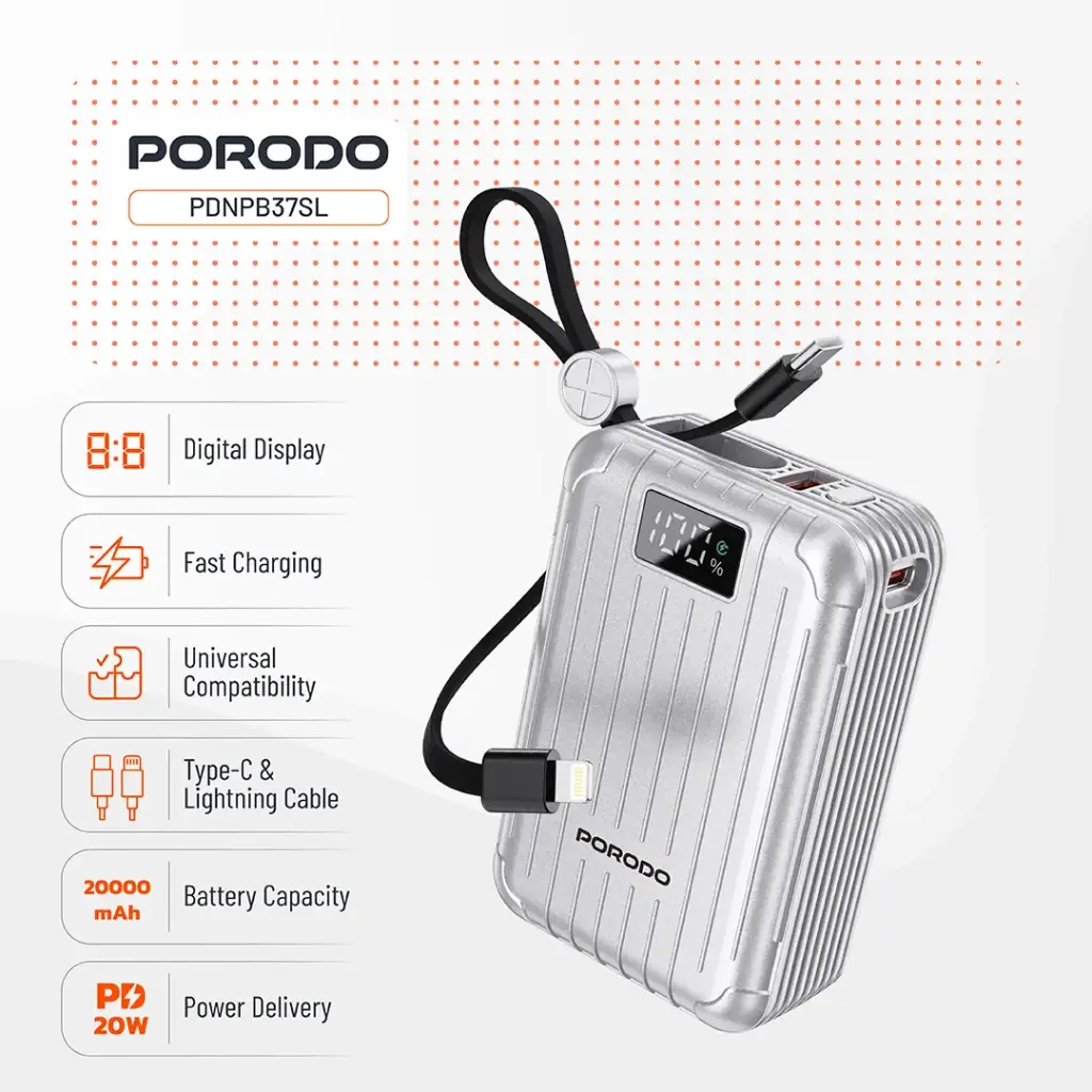 Porodo Petite 20000mAh PD 20W DISPLAY با ظرفیت بالا، شارژ سریع 20 وات، نمایشگر دیجیتال و طراحی کامپکت، انتخابی عالی برای کسانی است که به دنبال یک شارژر همراه قدرتمند و قابل اعتماد هستند.
