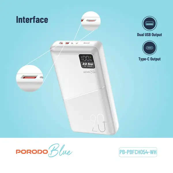 پاوربانک 20000 هزار 22.5 وات پرودو مدل PORODO Blue 20000mAh Quick Charge Power Bank
