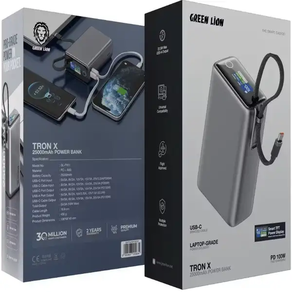 پاوربانک 25000 هزار 100 وات گرین لاین مدل Green Lion Tron X GNTRX20P100GY