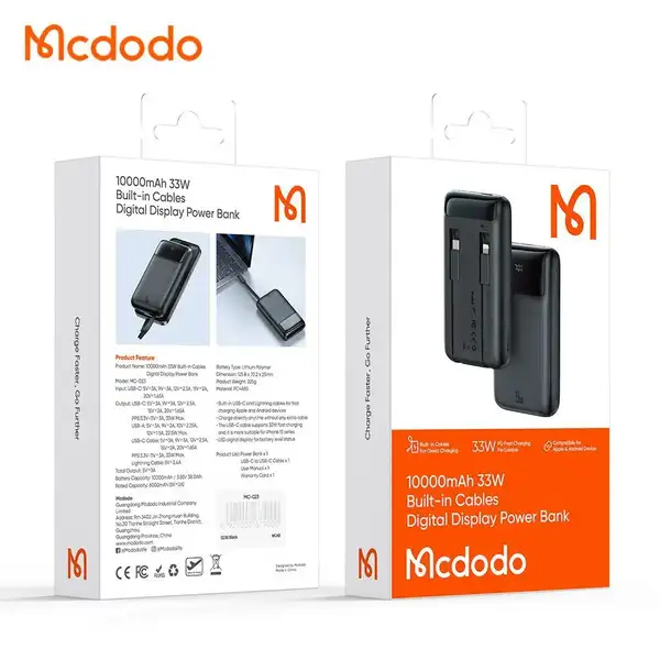 پاوربانک مکدودو مدل MC-0231 با توان ۳۳ وات، ظرفیت مناسب، کابلهای داخلی و طراحی هوشمندانه، گزینهای کامل برای کاربرانیست که به دنبال یک شارژر همراه سریع، سبک و چندمنظوره هستند.