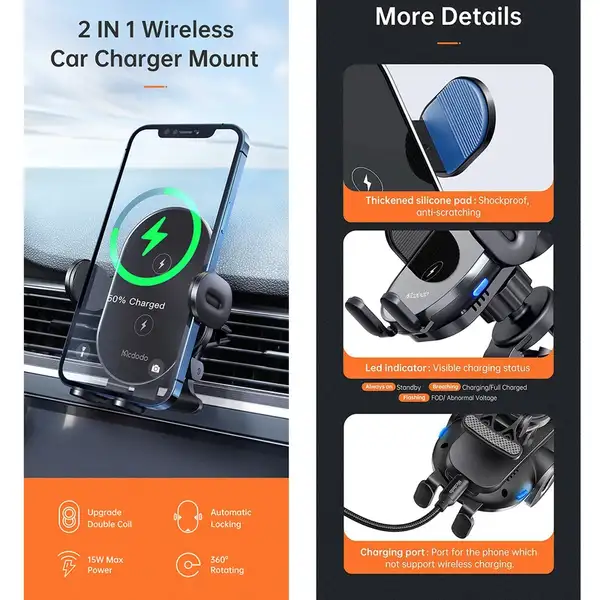 پایه نگهدارنده و شارژر بیسیم مک دودو مدل CH-160 یک محصول دوکاره با طراحی حرفهای است که امکان شارژ سریع بیسیم و نگهداری ایمن گوشی موبایل را بهطور همزمان فراهم میکند. این پایه با ساختار مقاوم، قابلیت تنظیم زاویه و پشتیبانی از شارژ 15 وات، گزینهای مناسب برای استفاده در خودرو، میز کار یا منزل است.