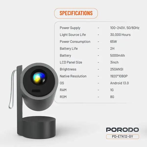 Porodo Full HD یک دستگاه چندمنظوره با کیفیت تصویر 1080p است که برای استفاده خانگی، آموزشی و کاری طراحی شده. این مدل با قابلیت اتصال بیسیم، اسپیکر داخلی و طراحی جمعوجور، تجربهای کامل از نمایش فیلم، ارائه و بازی را فراهم میکند.